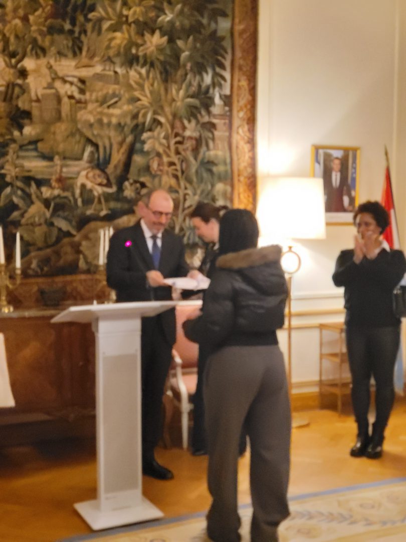 Lors de la remise des prix du Prix Victor Hugo de la Francophonie à la Résidence de France, Joyce Oliveira Mendes Levy, élève de la classe 4GSOF, a remporté le concours.Parmi une soixantaine de textes soumis par des élèves des lycées luxembourgeois et des écoles internationales, son texte a été retenu parmi les 10 finalistes par le jury.Félicitations à Joyce pour cette formidable réussite.